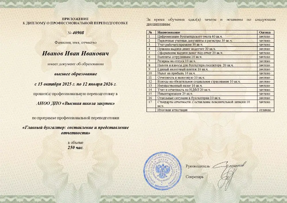 Профессиональная переподготовка. 256 академических часов, 8 модулей: постановка и ведение учета по общей системе налогообложения, налоги (НДС, налог на прибыль, НДФЛ) и страховые взносы, учет активов и расчетов, кадровый учет и расчет зарплаты, бухгалтерская и налоговая отчетность, планирование и внутренний контроль. Онлайн-обучение в Москве с итоговой аттестацией.