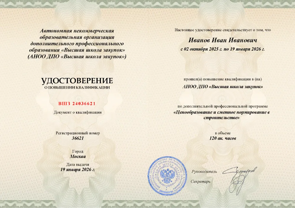 Повышение квалификации, 72 академических часа, 7 модулей: структура сметной стоимости, определение сметной стоимости материалов, методы определения сметной стоимости, работа с ФГИС и расчет ГЭСН, методика определения сметных цен на затраты труда, разработка и применение сметных норм, особенности ценообразования в строительстве. Онлайн-обучение в Москве с итоговой аттестацией.