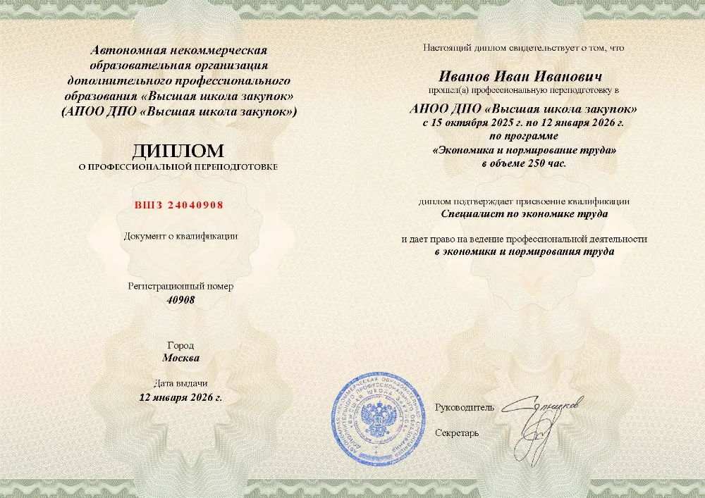 Профессиональная переподготовка, 250 академических часов, 3 модуля: трудовое право и законодательство, основы экономики и финансов организаций, организация, нормирование и регламентация труда, тарифно-квалификационная система и обеспечение требований охраны труда. Онлайн-обучение в Москве с итоговой аттестацией.