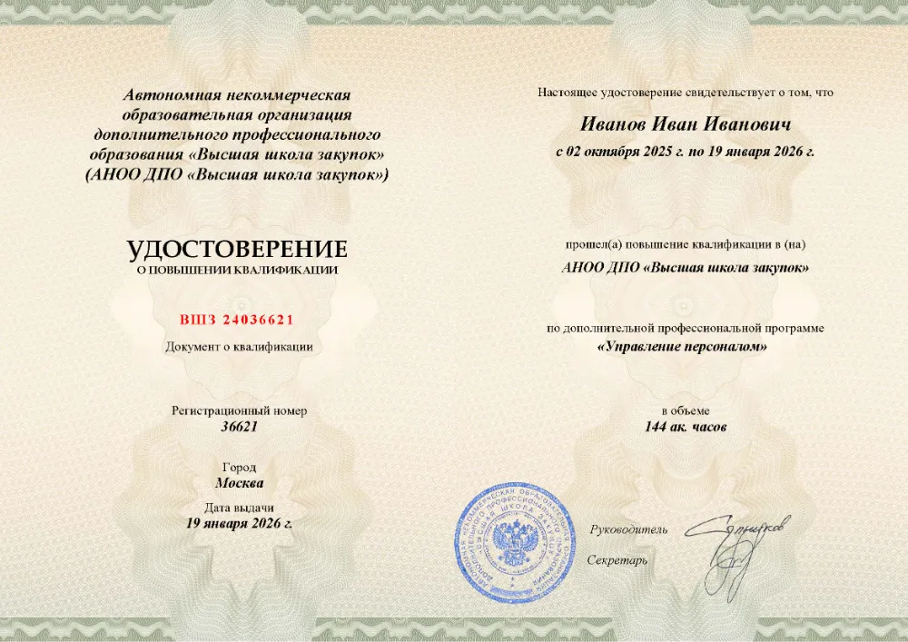 Повышение квалификации, 144 академических часа, 10 модулей: стратегическое кадровое планирование и ситуация на рынке труда, психология управления, документационное обеспечение, развитие, мотивация и вовлеченность персонала, работа с дистанционной занятостью и кадровым резервом. Онлайн-обучение в Москве с итоговой аттестацией.