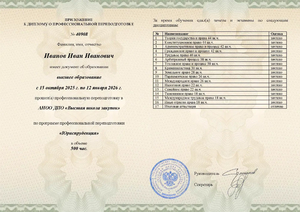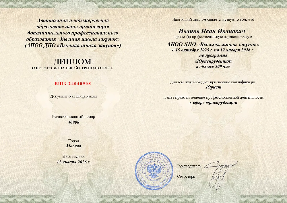 Профессиональная переподготовка, 500 академических часов, 16 модулей: теория государства и права, конституционное, гражданское, уголовное и трудовое право, арбитражный и административный процесс, налоговое, земельное, таможенное и международное право. Онлайн-обучение в Москве с итоговой аттестацией.