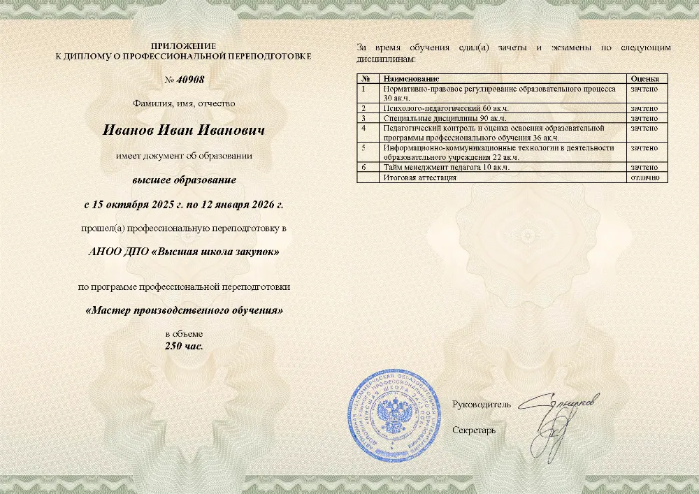 Профессиональная переподготовка, 250 академических часов, 6 модулей: нормативно-правовое регулирование образования, психолого-педагогические основы, специальные дисциплины, педагогический контроль и оценка, применение ИКТ в обучении, тайм-менеджмент педагога. Онлайн-обучение в Москве с итоговой аттестацией.