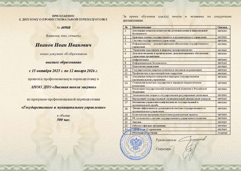 Профессиональная переподготовка, 500 академических часов, 25 модулей: правовые основы и система государственного управления, управление персоналом, финансами и противодействие коррупции, социальная политика и экономическое регулирование, цифровизация, закупки и информационная безопасность. Онлайн-обучение в Москве с итоговой аттестацией.