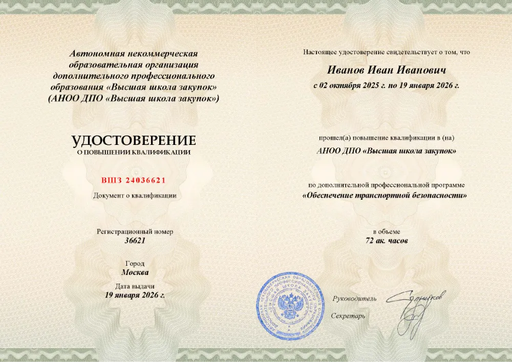 Повышение квалификации, 72 академических часа, 10 модулей: нормативная правовая база и система мер обеспечения транспортной безопасности, планирование и реализация защитных мероприятий, информационное обеспечение и государственный контроль, оценка состояния защищенности объектов. Онлайн-обучение в Москве с итоговой аттестацией.