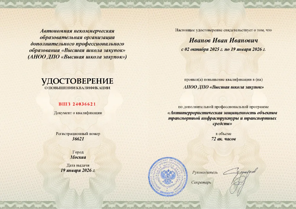 Повышение квалификации, 72 академических часов, 7 модулей: нормативно-правовые основы противодействия терроризму, анализ угроз и рисков, функциональные обязанности ответственных, инженерно-техническая укрепленность, документооборот и действия персонала при ЧС. Онлайн-обучение по всей России с итоговой аттестацией.